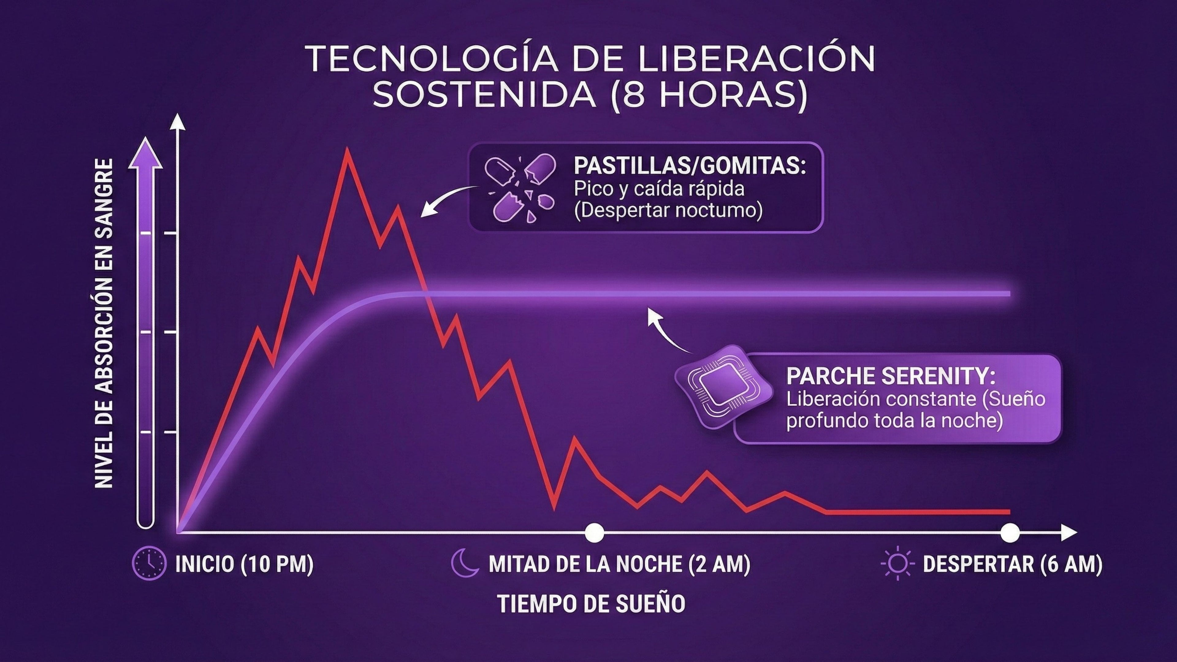 Estás agotado, pero tu mente repite problemas en bucle. El parche corta esa señal de alerta y fuerza al sistema nervioso a entrar en modo "Descanso Total".